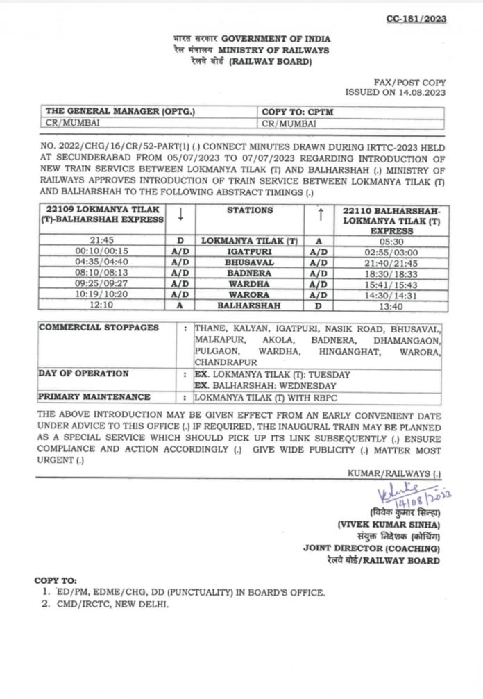 22109 लोकमान्य तिलक टर्मिनस-बल्लारशाह एक्सप्रेस, लोकमान्य तिलक टर्मिनस दिनांक 12.03.2024 से 21.45 बजे प्रस्थान करेगी। और अगले दिन 12.10 बजे बल्लारशाह पहुंचेगी.