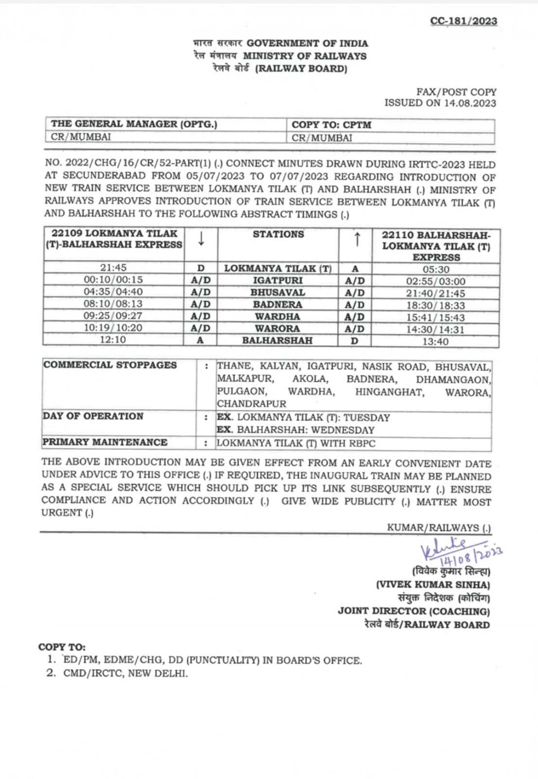22110 बल्लारशाह-लोकमान्य तिलक टर्मिनस एक्सप्रेस दिनांक 13.03.2024 से 13.40 बजे बल्लारशाह से रवाना होगी.और अगले दिन 05.30 बजे लोकमान्य तिलक टर्मिनस पहुंचेगी.