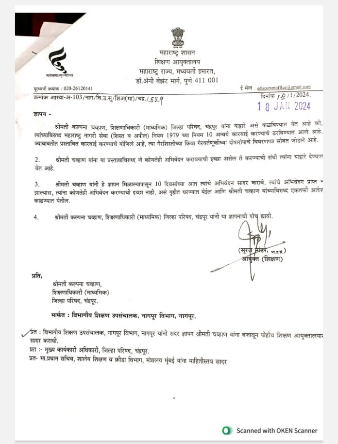 माध्यमिक शिक्षण विभाग जिल्हा परिषद चंद्रपूर यांना त्यांच्याविरुद्ध महाराष्ट्र नागरी सेवा शिस्त व अपील नियम 1979 च्या नियम 10 अन्वये कारवाई करण्याचे ठरवण्यात आले आहे.