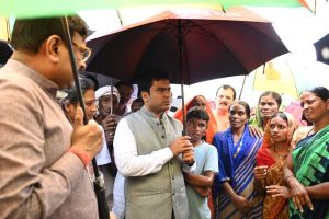 आठवडाभरापासून मुसळधार पावसाने हजेरी लावल्याने चंद्रपूर जिल्ह्यात पूर परिस्थिती निर्माण झाली आहे. या संकटाच्या काळात पूरपीडितांना मदतीचा हात देण्यासाठी राज्याचे वने, सांस्कृतिक कार्य, मत्स्यव्यवसाय मंत्री तथा जिल्ह्याचे पालकमंत्री सुधीर मुनगंटीवार सरसावले. लागोपाठ दोन दिवस भर पावसात त्यांनी पूरपीडितांच्या भेटी घेतल्या. पूरपीडितांच्या समस्या एकून घेतल्या.