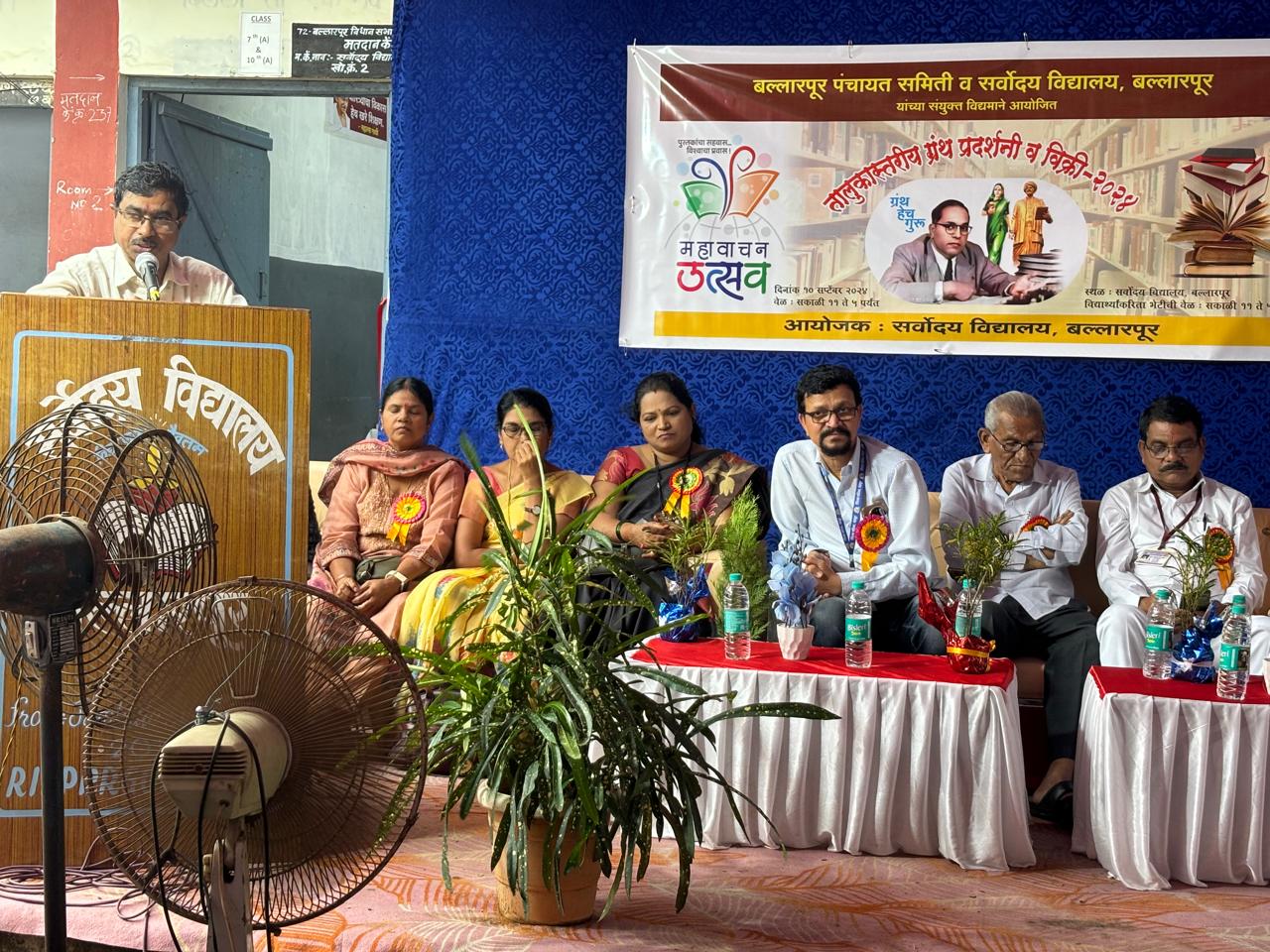 महावाचन उत्सव २०२४ अंतर्गत आयोजित तालुकास्तरीय ग्रंथ प्रदर्शनी चे उद्घाटन रविंद्र लामगे गटशिक्षणाधिकारी पंचायत समिती बल्लारपूर यांचे हस्ते गजभे मुख्याध्यापिका सर्वोदय विद्यालय यांचा अध्यक्षेत झाले. प्रमुख पाहुणे संजयभाऊ कायरकर अध्यक्ष महाराष्ट्र शिक्षण प्रसारक मंडळ, ज्येष्ठ पत्रकार वसंत खेडेकर, शिक्षिका भोंड केंद्रप्रमुख बामणी, शिक्षक नागेंद्र कुमरे केंद्रप्रमुख विसापुर, रुपाली मामीडवार गटसाधन व्यक्ती पंचायत समिती बल्लारपूर होते.