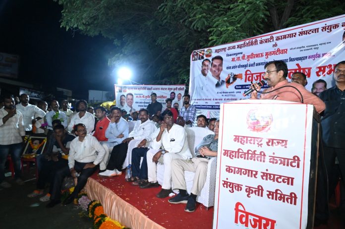 महाराष्ट्र राज्य महानिर्मिती कंत्राटी कामगार संघटना संयुक्त कृती समितीच्या वतीने आयोजित विजयी जल्लोष सभेत ना. मुनगंटीवार बोलत होते. यावेळी, महानिर्मिती कंत्राटी कामगार संघटना संयुक्त कृती समितीचे अध्यक्ष भाई भालाधरे, संयोजक नचिकेत मोरे, कार्याध्यक्ष बंडू हजारे,महानगराचे अध्यक्ष राहुल पावडे, भाजपा महामंत्री ब्रिजभुषण पाझारे,भाजपा महामंत्री डॉ. मंगेश गुलवाडे, गणेश सपकाळे, सतीश तायडे, शंकर गडाख, प्रमोद कोलारकर, अमोल मेश्राम, वामन मराठे, वामन बुटले तसेच कंत्राटी कामगार संघटनेचे पदाधिकारी, तसेच मोठ्या संख्येने कामगार उपस्थित होते.