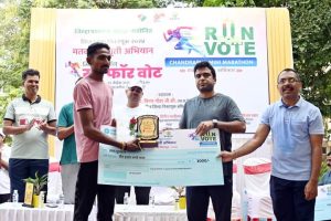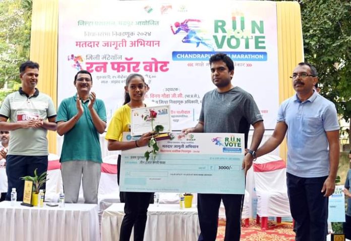 जिल्हाधिका-यांच्या उपस्थितीत समारोप व विजेत्यांना पुरस्कार वितरण : सदर मॅरेथॉन आझाद बगीचा पासून गिरनार चौक, गांधी चौक, जटपुरा गेटला वळसा घालून गेल्यानंतर आझाद बगीचा या ठिकाणी जिल्हा निवडणूक अधिकारी तथा जिल्हाधिकारी विनय गौडा जी.सी. यांच्या उपस्थितीत समारोप करण्यात आला. यावेळी जिल्हाधिकारी विनय गौडा जी.सी. यांनी मतदानाची टक्केवारी वाढावी, यासाठी आपण सर्वांनी जनजागृती करावी, असे आवाहन केले. मिनी मॅरेथॉन मध्ये मुले, मुली व ज्येष्ठ नागरिक या तिन्ही गटातून प्रथम, द्वितीय, तृतीय क्रमांक प्राप्त धावपटुला 3 हजार, 2 हजार, 1 हजार रुपयाचा धनादेश, सन्मान चिन्ह आणि प्रमाणपत्र देऊन सन्मानित करण्यात आले.