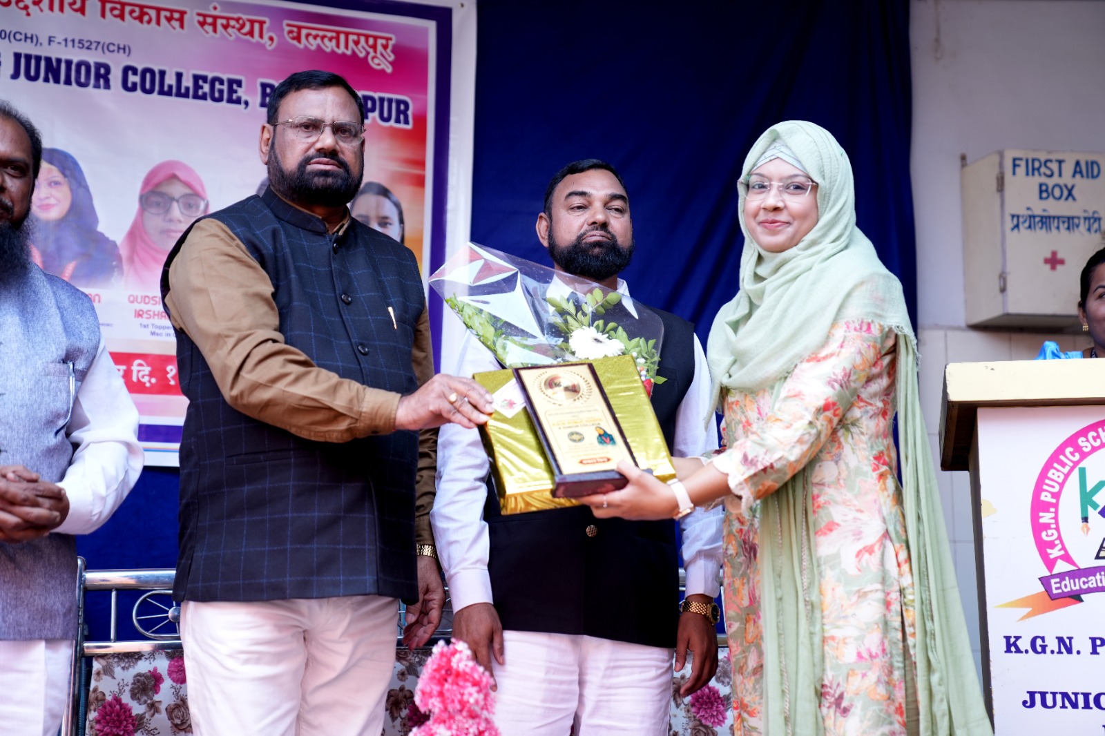 ख्वाजा गरीब नवाज अल्पसंख्याक बहुउद्देशीय विकास संस्था, बल्लारपूर संचलित KGN पब्लिक स्कूल आणि कनिष्ठ महाविद्यालयाने अल्पसंख्याक मुस्लिम समाजातील हुशार आणि उच्च शिक्षित मुलींचा सत्कार केला, ज्यामध्ये अलीकडे सोनी वाहिनीवर लोकप्रिय टीव्ही शो कौन बनेगा करोडपती (KBC) प्रसारित झाला. होस्ट प्रसिद्ध सिने अभिनेते अमिताभ बच्चन यांच्या विरुद्ध हॉट सीटवर पोहोचणारी सामाजिक कार्यकर्ते महमूदखान पठाण यांची मुलगी जमजमने, चार्टर्ड अकाउंटंट (सीए) परीक्षेत यश संपादन केलेली फिरदोस सय्यद, गोंडवाना विद्यापीठातून भौतिकशास्त्रात भारताचे महामहिम राष्ट्रपती दौपदी मुर्मू च्या हस्ते सवर्णपदक मिळवणारी सदफ अन्सारी, आणि रसायनशास्त्र विषयात विद्यापीठातील टॉपर कुदसिया सिद्दीकी यांच्या शिक्षक आमदार सुधाकरजी अडबाले सर यांच्या हस्ते स्मृतीचिन्ह, फुलांचा गुच्छ आणि भेटवस्तू देऊन सत्कार करण्यात आला. कार्यक्रमाच्या अध्यक्षस्थानी शाळेचे संस्थापक शेख महेमूद होते. यावेळी व्यासपीठावर शाळेच्या मुख्याध्यापिका सुजाता करमणकर, उपमुख्याध्यापिका सीमा माकडे, शाळेच्या प्रशासक झीनत खान उपस्थित होते. यावेळी पाहुण्यांनीही शाळेतील विद्यार्थ्यांना मार्गदर्शन करून कार्यक्रम यशस्वी करण्यासाठी प्रयत्न केले.