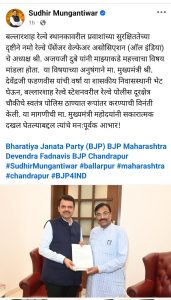 स्थानिक आमदार श्री. सुधीरभाऊ मुनगंटीवार यांच्या प्रयत्नांमुळे, वर्धा सरकारी रेल्वे पोलिस स्टेशन (जीआरपी) अंतर्गत येणाऱ्या बल्लारशाह रेल्वे स्टेशन आउट पोस्ट पोलिस चौकीला लवकरच पोलिस ठाणे म्हणून अपग्रेड केले जाण्याची शक्यता आहे. सुधीर भाऊ यांनी मुख्यमंत्री श्री देवेंद्र फडणवीस १० जुलै रोजी यांची भेट घेतली आणि यासंदर्भात विनंतीही केली, ज्याला त्यांनी सकारात्मक प्रतिसाद दिला. पुलिस महासंचालक श्रीमती रश्मि शुक्ला याची पण भेंट घेतली होती