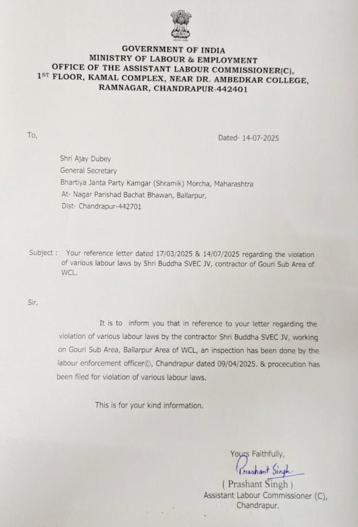 भाजपा कामगार मोर्चा प्रदेश महासचिव अजय दुबे की शिकायत पर श्रमिकों का शोषण करने/ नियमों का उल्लंघन करने के आरोप में असिस्टेंट लेबर कमिश्नर (सेंट्रल) चंद्रपुर ने बल्लारपुर कोयला क्षेत्र WCL अंतर्गत गोवरी उपक्षेत्र में कार्यरत बुद्धा SVEC JV कंपनी के विरुद्ध राजूरा न्यायालय में मुकदमा दायर किया है.