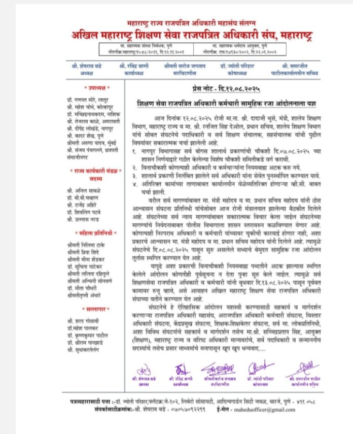 यापुढे अशा प्रकारची विनाचौकशी नियमबाह्य पद्धतीने अटक झाल्यास स्थगित केलेले आंदोलन कोणतीही पूर्वसूचना न देता पुन्हा सुरू केले जाईल. त्यामुळे सर्व शिक्षण सेवा राजपत्रित अधिकारी व कर्मचारी यांनी बुधवार दिनांक:13/08/ 2025 पासून पूर्ववत कामावर रुजू व्हावे, असे आवाहन अखिल महाराष्ट्र शिक्षण सेवा राजपत्रित अधिकारी संघाच्या वतीने करण्यात येत आहे.