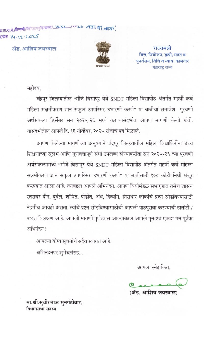 दरम्यान, दि. १४ डिसेंबर २०२५ रोजी राज्यमंत्री आशिष जयस्वाल यांनी १०० कोटी रुपयांचा निधी मंजूर झाल्याची माहिती पत्राद्वारे कळविली आहे. ‘आपण केलेल्या मागणीच्या अनुषंगाने चंद्रपूर जिल्ह्यातील महिला व विद्यार्थिनींना उच्च शिक्षणाच्या सुलभ आणि गुणवत्तापूर्ण संधी उपलब्ध होण्याकरीता २०२५-२६ च्या पुरवणी अर्थसंकल्पामध्ये “मौजे विसापूर येथे एसएनडिटी महिला विद्यापीठ अंतर्गत महर्षी कर्वे महिला सक्षमीकरण ज्ञान संकुल उपपरिसर उभारणी करणे” या बाबीसाठी १०० कोटी निधी मंजूर करण्यात आला आहे. त्याबद्दल आपले अभिनंदन. आपण विधीमंडळ सभागृहात तसेच शासन स्तरावर दीन, दुर्बल, शोषित, पीडीत, अंध, दिव्यांग, निराधार लोकांचे प्रश्न सोडविण्यासाठी नेहमीच आग्रही असता. त्यांचे प्रश्न सोडविण्यासाठीची आपली पाठपुरावा करण्याची पध्दत विलक्षण आहे. आपली मागणी पुर्णत्वास आल्याबद्दल आपले पुनःश्च एकदा मनःपूर्वक अभिनंदन,’ असे पत्र राज्यमंत्री आशिष जयस्वाल यांनी आ. श्री. मुनगंटीवार यांना पाठवले आहे.