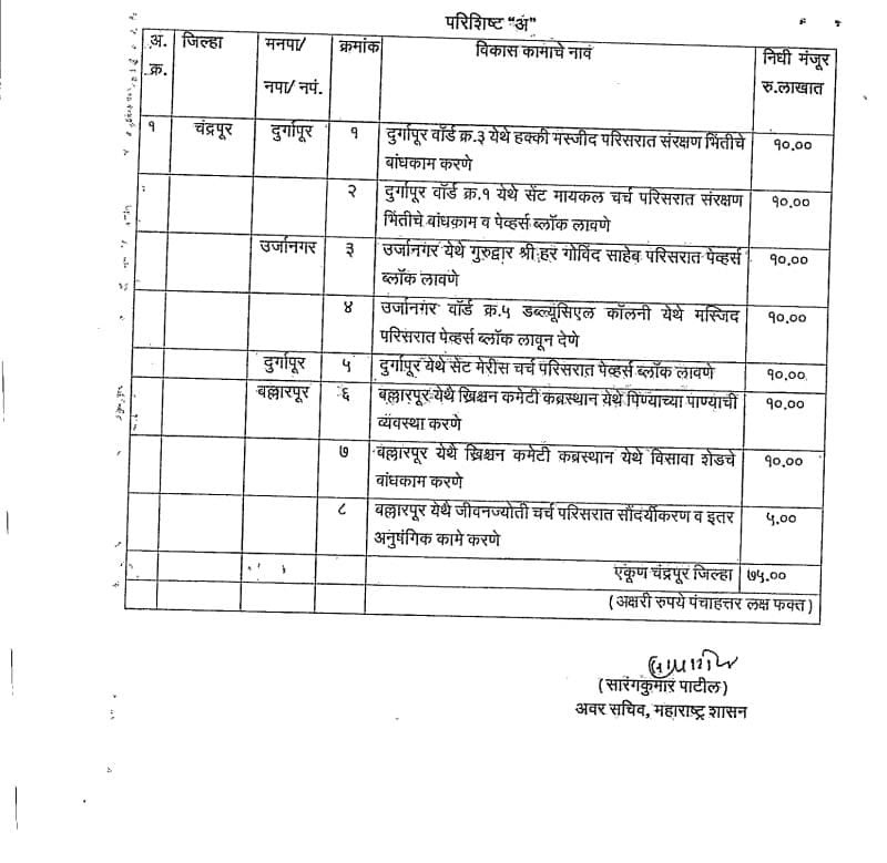 बल्लारपूर मतदारसंघातील अल्पसंख्याक बहुल भागांमध्ये नागरी सुविधा, सुरक्षितता आणि सौंदर्यीकरणाच्या दृष्टीने हा निधी महत्त्वाचा ठरणार असून स्थानिक विकासाला चालना मिळणार आहे.