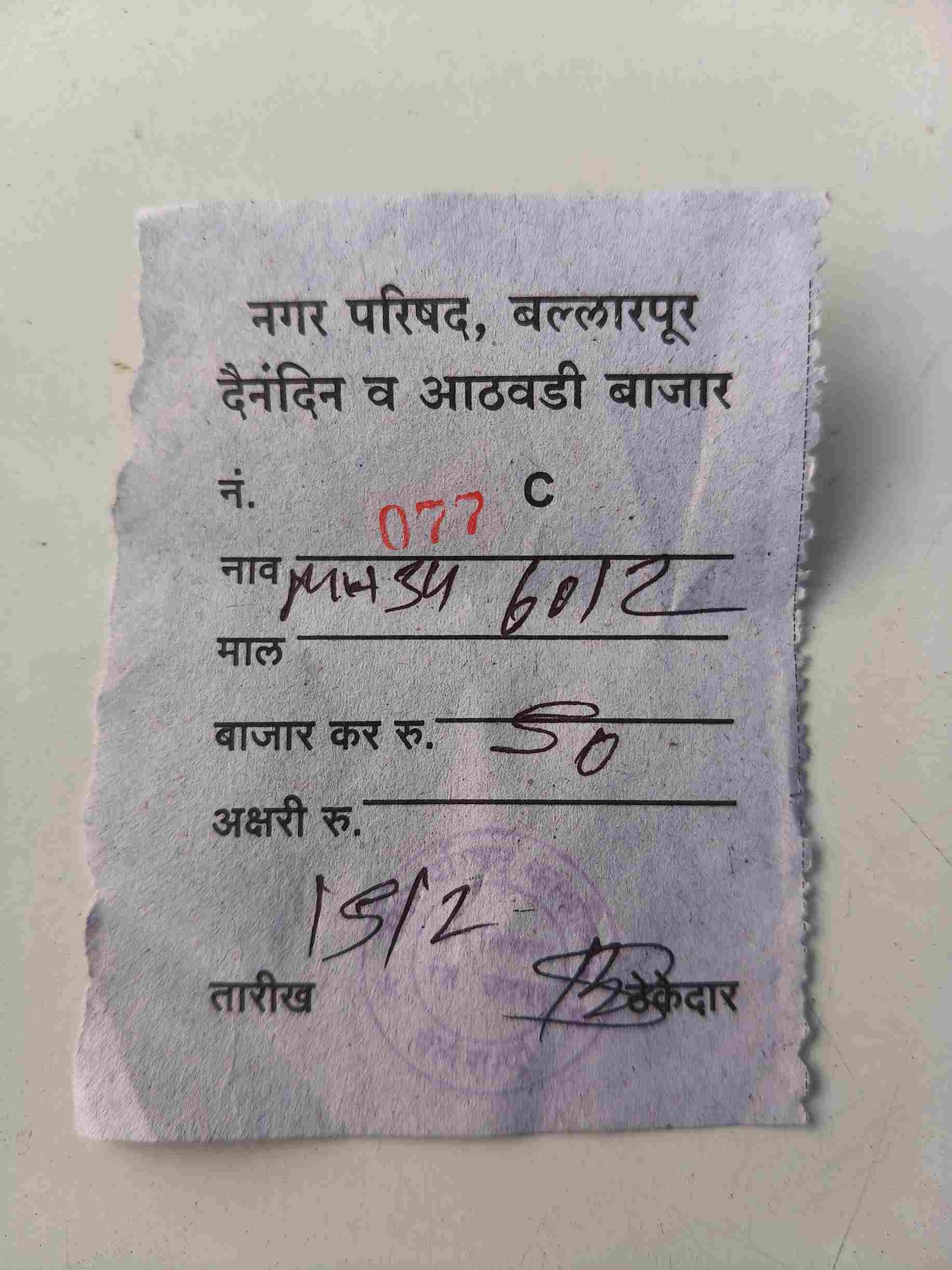 नगरपरिषद बल्लारपूर दैनंदिन व आठवडी बाजार ठेकेदाराने पावती देऊनच वसुलीची रक्कम घ्यावी, अशी मागणी नागरिकात जोर धरत आहे.