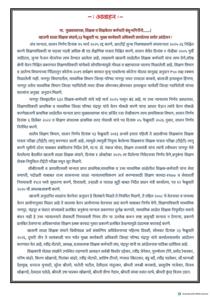 खासगी शाळा शिक्षक संघाने विधीमंडळ  अर्थ संकल्पिय अधिवेशनाच्या पहिल्या दिवशी, सोमवार दिनांक २३ फेब्रुवारी २०२६ ,दुपारी तीन ते सायंकाळी पाच पर्यंत मुख्य कार्यकारी अधिकारी जिल्हा परिषद चंद्रपूर यांचे कार्यालयासमोर आंदोलन करण्यात येत आहे, रवींद्र मोटघरे, अध्यक्ष, प्रजासत्ताक शिक्षक कर्मचारी संघ, चंद्रपूर यांनी या आंदोलनास पाठिंबा दर्शविला आहे.