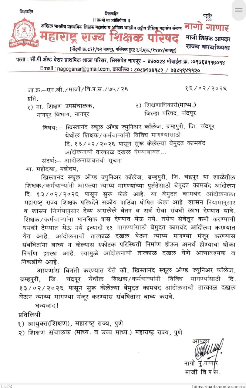 ख्रिस्तानंद विद्यालय ब्रह्मपुरी येथील शिक्षक तथा शिक्षकेतर कर्मचारी आपल्या न्याय मागण्यासाठी मागील 13 फेब्रुवारी 2026 पासून शाळेसमोर धरणे आंदोलन करीत आहे.