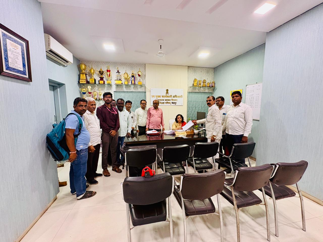 [फोटौ :- नुतन सावंत उप मुख्य कार्यकारी अधिकारी यांना निवेदन देताना किशोर दरेकर, रवींद्र जेनेकर, रवींद्र फडतरे, विजय खोब्रागडे व इतर पदाधिकारी]