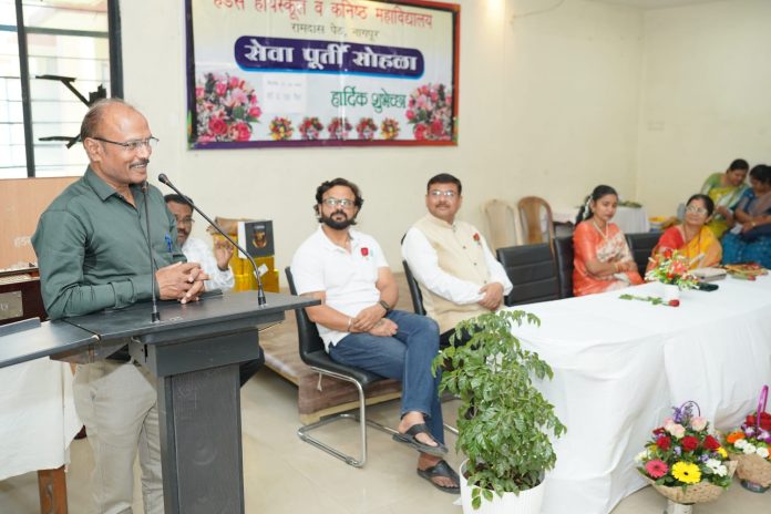 [ फोटो :- सेवानिवृत्त इंग्रजी विषय शिक्षक एकनाथ वैद्य सत्काराला उत्तर देताना, मंचावर प्राचार्य अजय लाबडे, सौ.माधुरी वैद्य ]