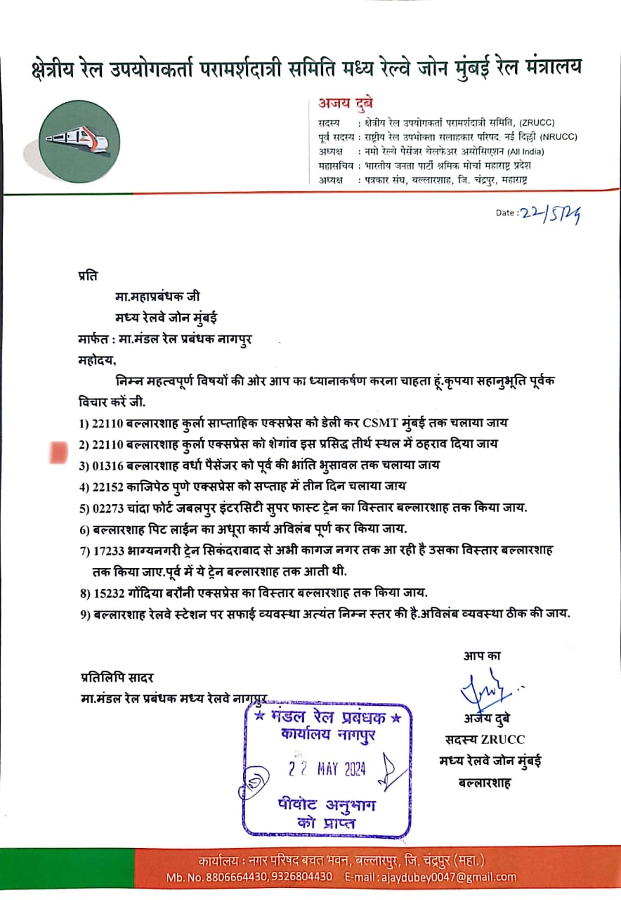 उल्लेखनीय है कि स्थानीय विधायक एवं पूर्व कैबिनेट मंत्री मा. श्री सुधीरभाऊ मुनगंटीवार जी के माध्यम से रेल उपयोगकर्ता परामर्शदात्री समिति ZRUCC मध्य रेलवे सदस्य अजय दुबे काफ़ी समय से प्रयासरत थे.