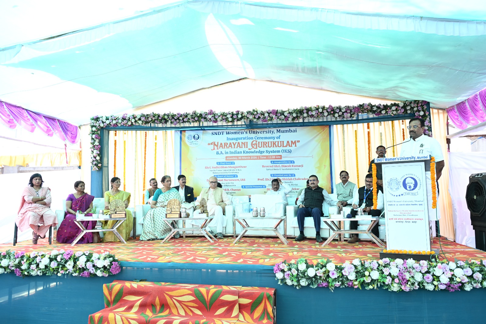 कार्यक्रमाला राज्यपाल कार्यालयाचे सचिव डाॅ. प्रशांत नारनवरे, भारतीय ज्ञान विज्ञानचे आचार्य दिनेश कुमार, एसएनडीटी विद्यापीठाच्या कुलगुरू डॉ. उज्वला चक्रदेव, कुलसचिव डॉ. विलास नांदावडेकर, भाग्यस केंद्राचे संचालक जितेंद्र कुमार तिवारी, आजीवन अध्ययन केंद्राचे संचालक प्रभाकर चव्हाण, भाजपा नेते चंदनसिंग चंदेल,बल्लारपूर एसएनडीटी विद्यापीठ उपकेंद्राचे संचालक डाॅ. राजेश इंगोले,उपकुलसचिव डॉ. बाळू राठोड, व्यवस्थापन परिषद सदस्य पौर्णिमा मेहता, डॉ. प्रांजल बोगावार, चित्रा जोशी, सिनेट सदस्या डॉ. मंजुषा कानडे, प्राचार्य डॉ. निता लांबे, डॉ. सुशील मुंदडा, सन्मित्र सैनिक विद्यालयाच्या प्राचार्य अरुंधती कावडकर, अॅड. निलेश चौरे, डाॅ. दीनदयाल कावरे, कार्यकारी अभियंता मुकेश टांगले, अधीक्षक अभियंता सोनाली चव्हाण आदी उपस्थित होते